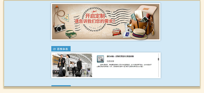 Project Description 百悦逸游于2012年初由二位资深的旅行家创办,是成都传媒集团旗下成都新闻国际旅行社有限公司的高端旅游品牌,总部位于成都高新区天府大道中段美年广场。在百悦逸游成立之前,创始团队亲自到全球三十多个国家实地考察,带着第一手的资讯和执着的信念创立了中国西部第一家真正意义上的私人定制旅行机构。百悦的旅行不是跟团挤大巴,不是十天去十个国家,更不是没完没了的... Official website address 楚雄http://www.100.travel I want to share